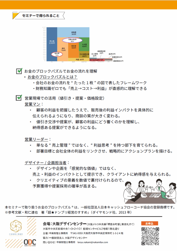 当時は知らなかった「お金のブロックパズル」を、もし営業時代に知っていたら…という自身の経験をふまえ、セミナーでは営業職やデザイナーの方々が「明日からすぐに使える」実践的な知識をお伝えします。