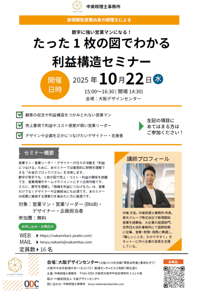 数字が苦手でも、1枚の図で売上・コスト・利益の関係を把握でき、営業現場やチームマネジメントにすぐ応用可能です。 さらに、数字を理解し「価値を利益につなげる力」は、営業だけでなくデザイナーや企画担当にも必須です。本セミナーは成果に直結する提案力を高めたい方に最適です。