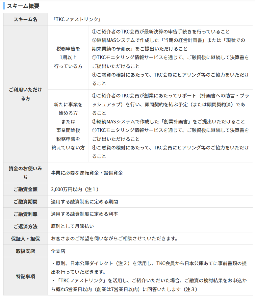 TKC会員が、決算書・試算表・経営計画書等を事前に整えたうえで連携することで、融資の検討結果について、申込から概ね5営業日以内(創業は7営業日以内)の回答が目安となる仕組みです。通常は概ね2〜3週間程度かかるところ、より迅速な資金調達につながる可能性があります。